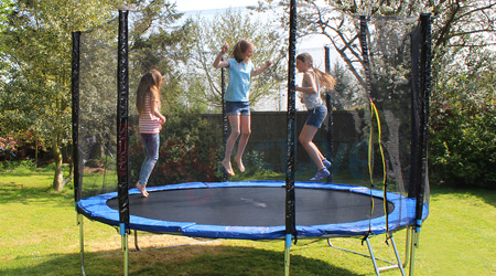 A trampoline is a device consisting of a piece of taut, strong fabric stretched between a steel frame using many coiled springs. People bounce on trampolines for recreational and competitive purposes.